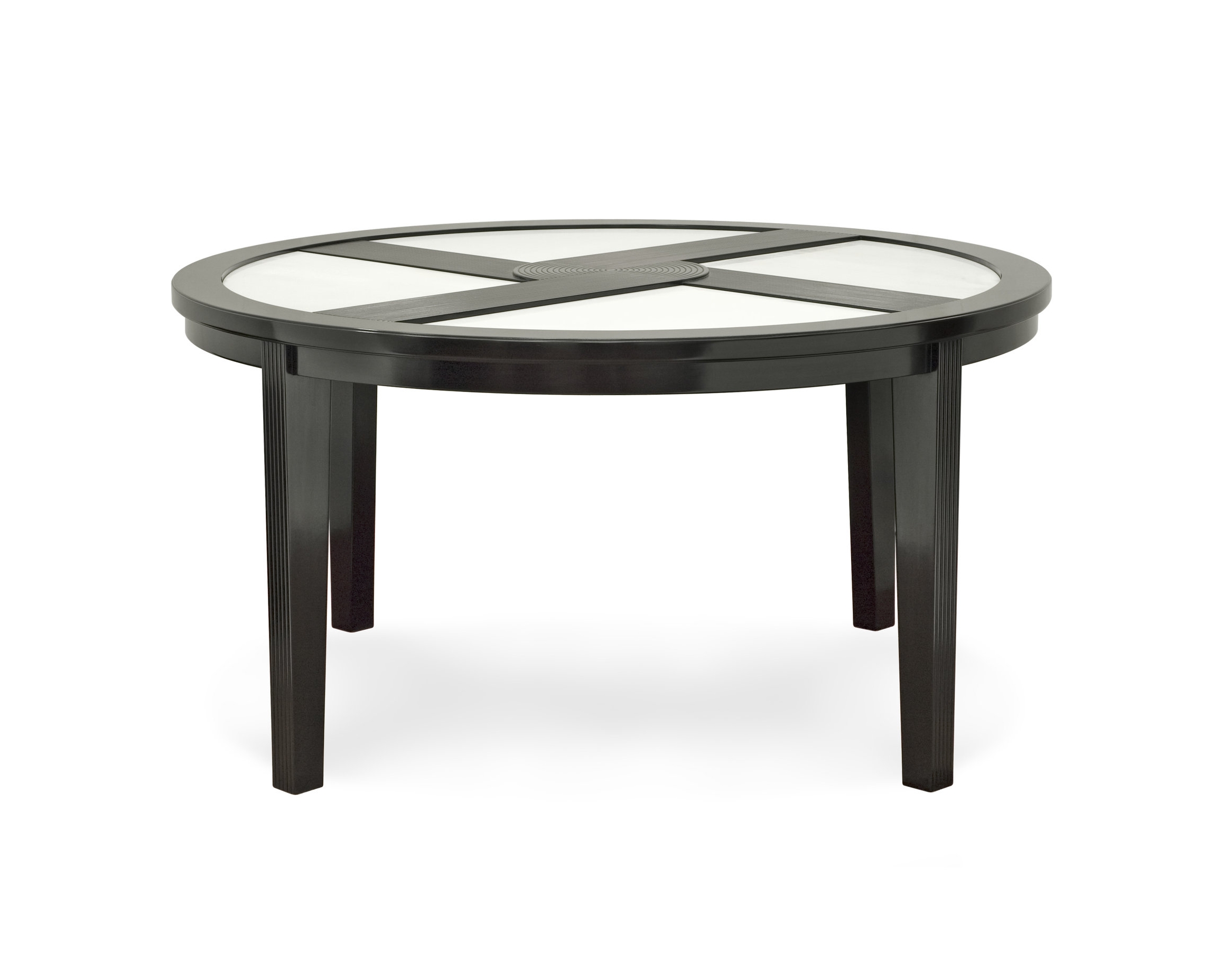 The mood changes in the dining space, with a bespoke round dining table set in Art Deco style. The hint of old Shanghai is intentional, with the use of off white colored and satin finished marble inset on the table top.